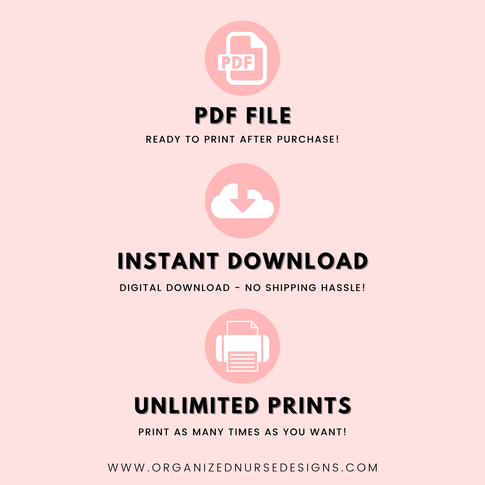 You will receive a total of 18 printable templates to fit your needs & stay organized as a nurse or nursing student! Feel free to message me if you need the times changed and/or different colors/styles :)